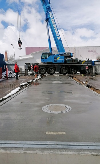 Die Brückenwaage hat eine Länge von 18 Meter sowie eine Breite von 3 Meter und kann ein Gewicht von bis zu 50 Tonnen erfassen.