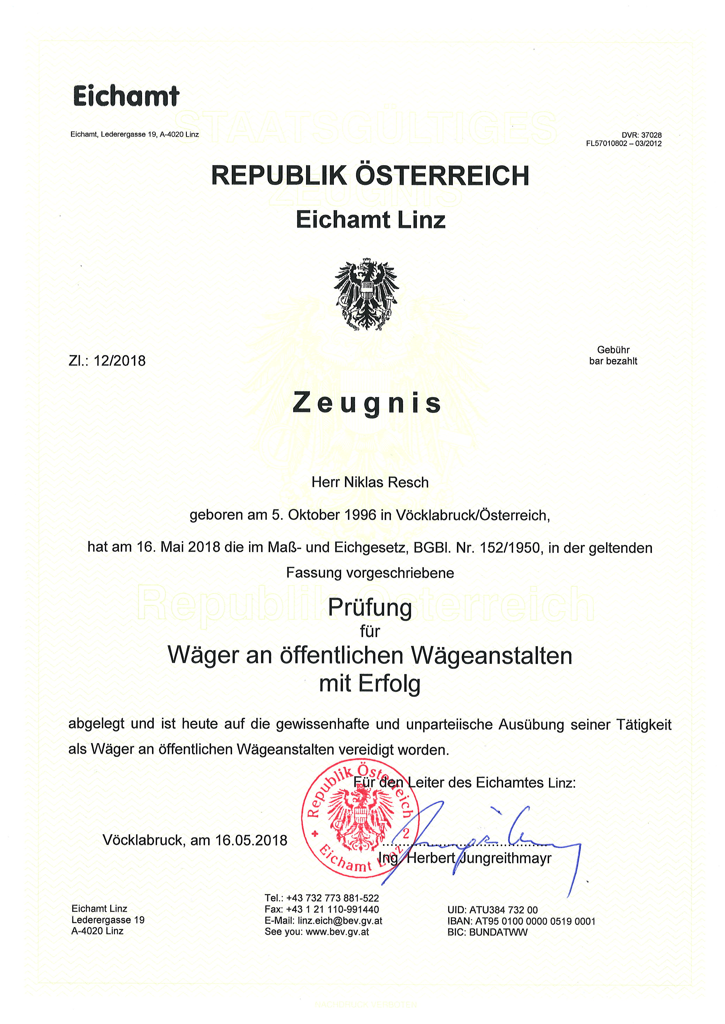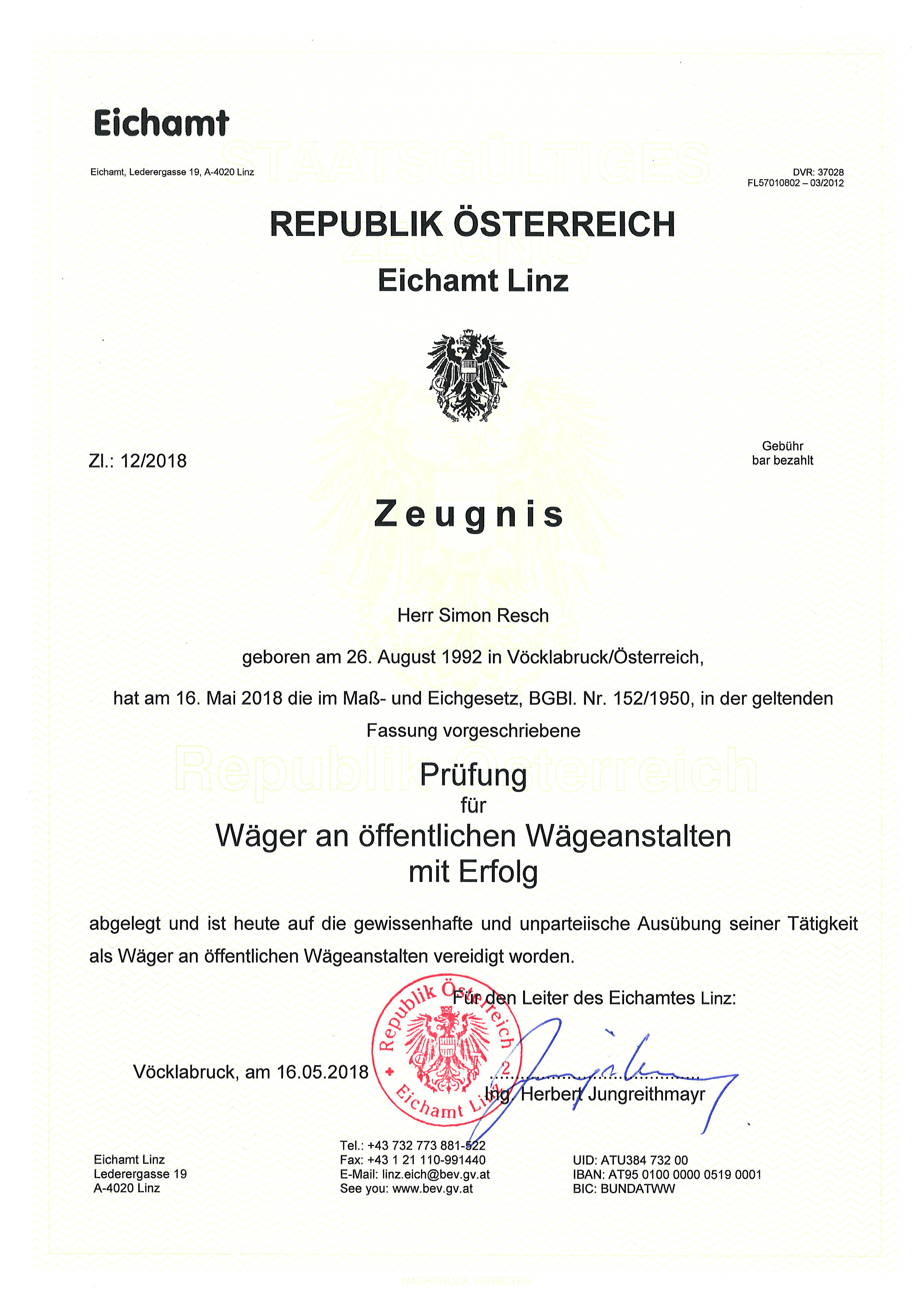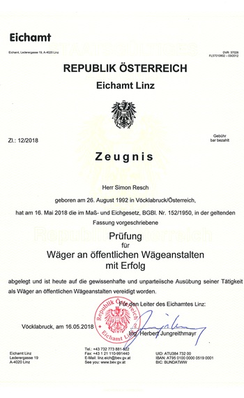 Aufgrund der Wiegung durch einen beeideten Wiegemeister